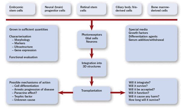 Now, assuming the cells and the tissues are ready to generate retina, will they integrate into the adult retina? Unlike the clinical application of cultivated epithelial cells for ocular surface reconstruction, the use of neural cells poses tough challenges. More rigid proof of integration of these cells is warranted. Successful cell therapy should fulfill the following criteria: the desired cells should multiply/grow in sufficient quantities, organise into functional units, survive and integrate into the host, and ultimately, function appropriately in a safe manner.