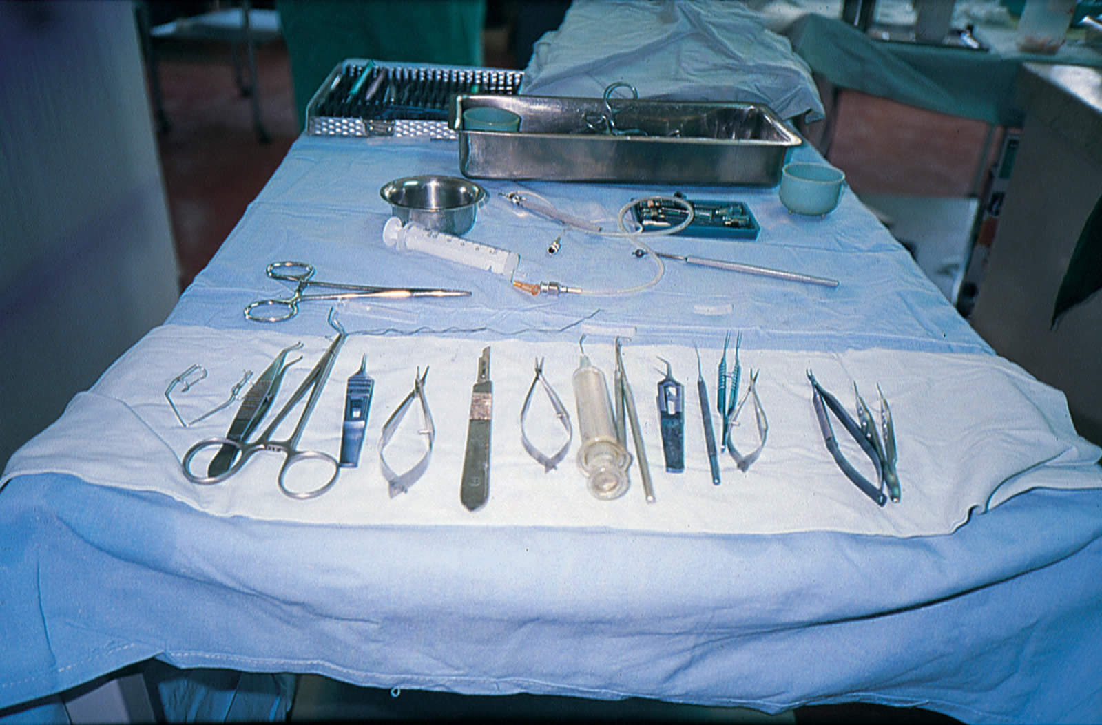 With repeated sterilization, instruments will become stiff and difficult to open. A good quality sewing machine oil or silicone oil should be used each week on hinged instruments. This is especially relevant when working in a very hot, dry climate.