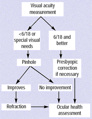 All patients should be tested using a Snellen acuity test (E Chart) at distance. Those with <6/6 vision should then be further tested with a pinhole test. Should the vision improve to 6/6 then the patient is classified as having a refractive error. Those patients with no improvement to 6/6 with a pinhole, are classified as non-refractive and referred to a secondary level for a full eye examination.