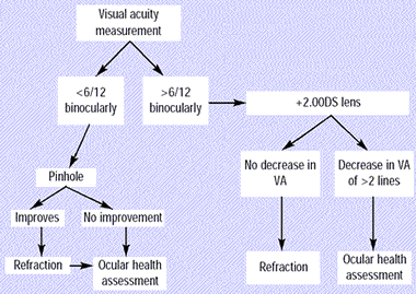 Should there be no occupational demands, patients with 6/18 or better (binocularly) need not be referred for a refraction while those with occupational demands should be referred to the secondary level for a full eye examination. Patients with 6/18 and better but with near occupational visual demands should be dispensed presbyopic glasses (‘readers’).