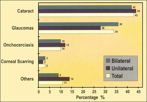 In a 3 year (1993-95) prospective study, bilateral (n = 5954) or unilateral (n = 2601) blindness (visual acuity less than 3/60) was documented in 8,555 patients. The causes are given in Table 1.
