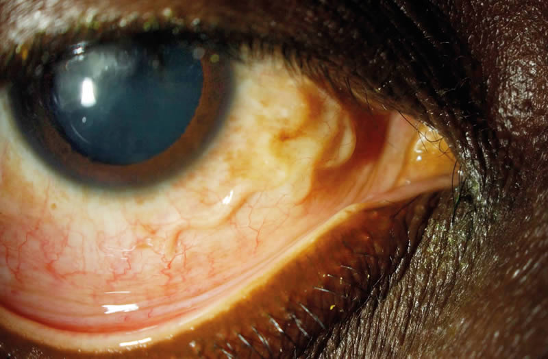 A 35-year-old man presented at our eye clinic with a 2-day history of a red, sore and watery right eye. He had visited Cameroon 4 months prior to presentation.