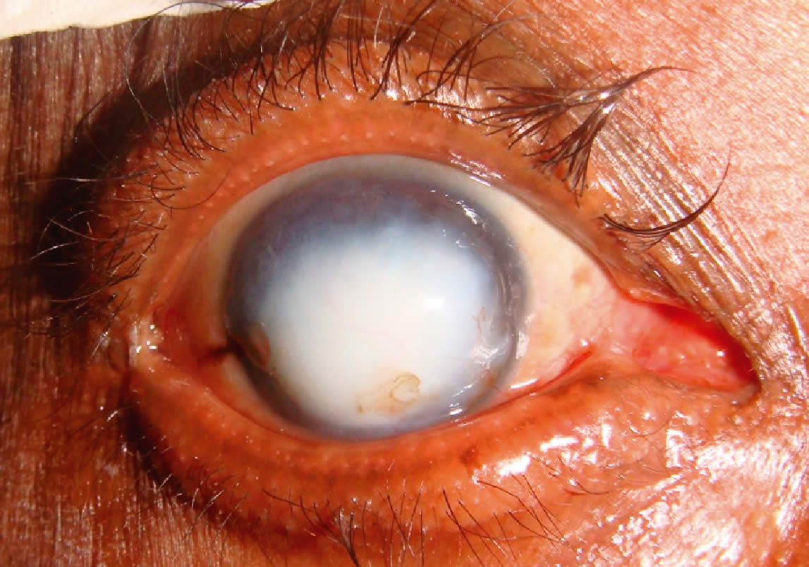 Mr Massae (not his real name) is a forty-eight year old farmer who recently presented at a tertiary ophthalmology unit in Tanzania with a three-week long history of pain, purulent discharge, and loss of vision in the left eye. Several days after the onset, he had received treatment from his local health centre (chloroamphenicol drops), but his eye continued to get worse. At presentation, he had a large corneal ulcer with infiltration and a hypopyon. A filamentous fungus was cultured from microbiology specimens. He was treated with intensive topical antifungal (econazole) and anti-bacterial (ciprofloxacin) drops, a topical cycloplegic (atropine), and an oral antifungal medication (itraconazole). A small corneal perforation developed which plugged with iris and then sealed. The infection gradually responded to prolonged antifungal therapy, leaving a dense scar and small eccentric pupil (Figure 1). Four years earlier, Mr Massae had lost sight in his right eye due to severe suppurative keratitis following a minor corneal abrasion from a maize leaf; this caused dense scarring of his right cornea (Figure 2). Mr Massae is now blind.