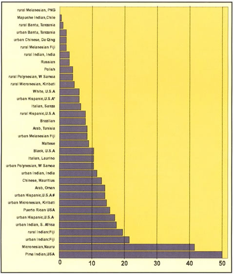 Fig. 1: Prevalence of diabetes in the age range 30-64 years in selected populations worldwide (age-standardized, sexes combined). © Hugh Lugg