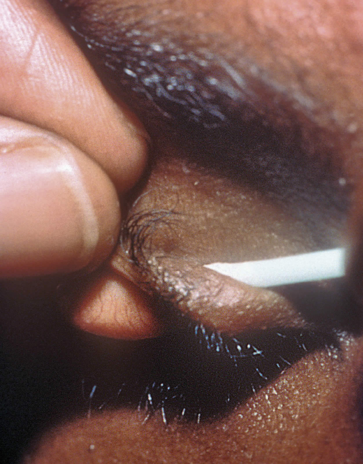 - With one hand, hold the eyelashes of the upper eyelid between thumb and index finger