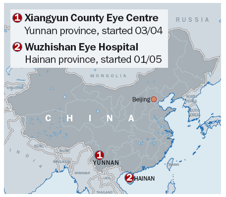 In March 2004, we initiated a rural project in Xiangyun County, Yunnan Province, to build a modern eye disease prevention centre within the Xiangyun County Hospital, a government hospital. Ten months later, we launched another rural project in Wuzhishan County, in the central highlands of Hainan Province. The project partner, Wuzhishan Eye Hospital, is privately owned but registered as a non-profit NGO hospital. We chose these two dissimilar hospitals in order to explore different ways of increasing the volume of cataract surgery in China.