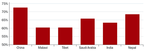 It is well established that the major cause of blindness in poor countries is cataract. Figure 2 is derived from population-based surveys in several countries and shows that 60 to 65 per cent of those blind from cataract are female. This is partly because women live longer than men and thus are more likely to develop cataract. In addition, women have been shown to have a slightly increased ageadjusted risk of cataract.2 Cataract blindness, however, can be cured, or even prevented if the operation is done early enough, and herein lies the crucial imbalance: women do not receive cataract surgery at the same rate as men. Figure 3 shows the cataract surgical coverage (which measures the proportion of the need for cataract surgery in the community that is being met) reported in a number of studies. These coverage figures are higher for men.3-5
