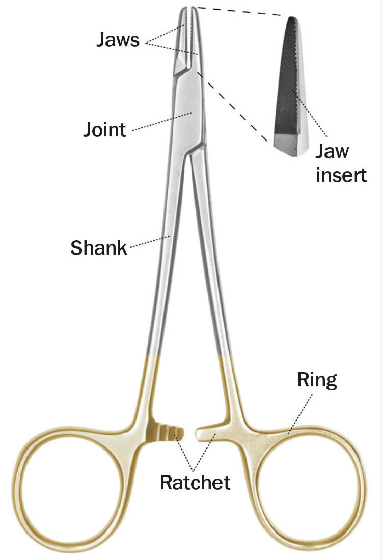 Figure 1. The main parts of a needle holder. The handles consist of a shank, a ring, and a ratchet mechanism that locks the needle in place. © Ismael Cordero