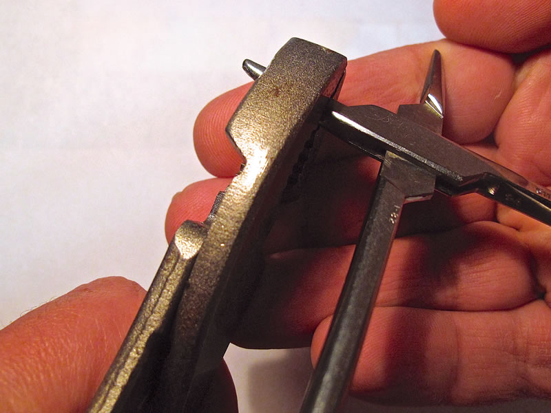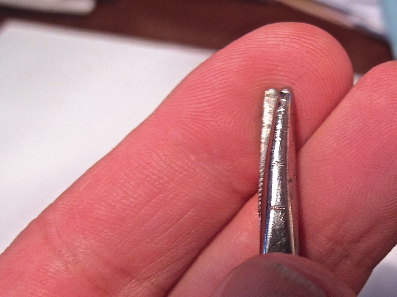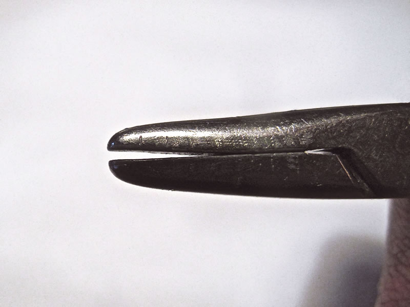 1 Close the needle holder, and look at it from the side. If you notice that the jaw tips are not aligned (Figure 4), then at least one tip is bent and you can try to straighten it with flat-tipped pliers (Figure 5). If it is not obvious which tip is bent, you can take turns bending both tips so that they align. Note: do not use too much force; bend the tips little by little.