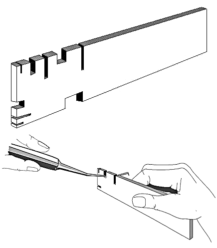 The suggested dimensions for a bending tool are one inch wide, five inches long and 1/8 to 1/4 inch thick. The bending tool should be made from brass or mild steel (Figure 3). The grooves on the tool can vary in width from the thinnest cut that you can make up to about 1/8 to 1/4 of an inch. Narrow slots are preferable. The slots can be cut with a hacksaw and smoothened or widened with a file (Figure 4).
