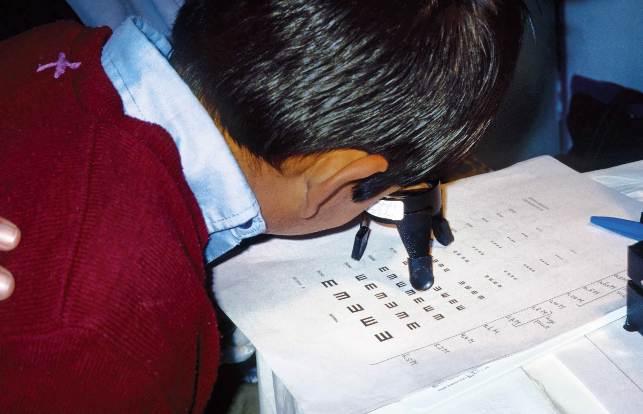 Most children with low vision can significantly increase their near visual acuity by employing their strong ability to focus on nearby objects (accommodation), or by ‘squinting’ to produce a pinhole effect if they have poor accommodation. Children with low vision normally achieve the required magnification by the ‘approach method’, i.e. by moving their eyes closer to the object of interest to see it in more detail. The magnification gained in this way is called relative distance magnification.