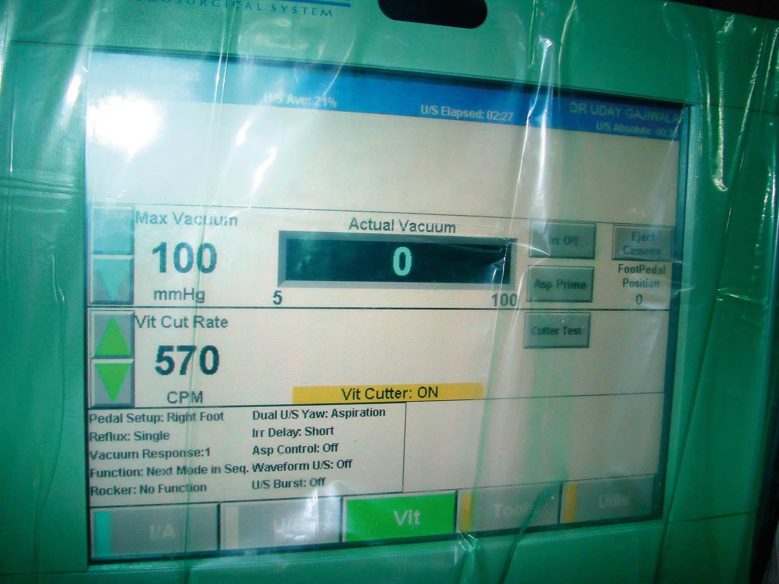 Vitrectomy parameters set on a phaco machine used to perform automated vitrectomy after capsular rupture and vitreous loss. INDIA. Photo: Kasturba Hospital. Published in: Community Eye Health Journal 21 No. 65 MARCH 2008 www.cehjournal.org
