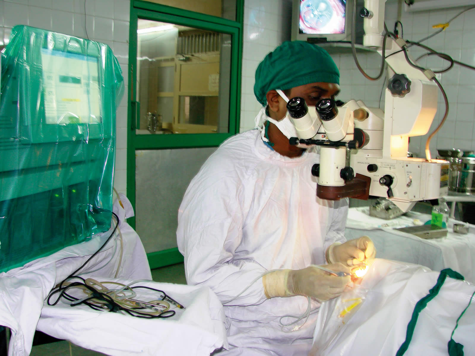 A surgeon performs a vitrectomy after capsular rupture and vitreous loss. INDIA. © Kasturba Hospital