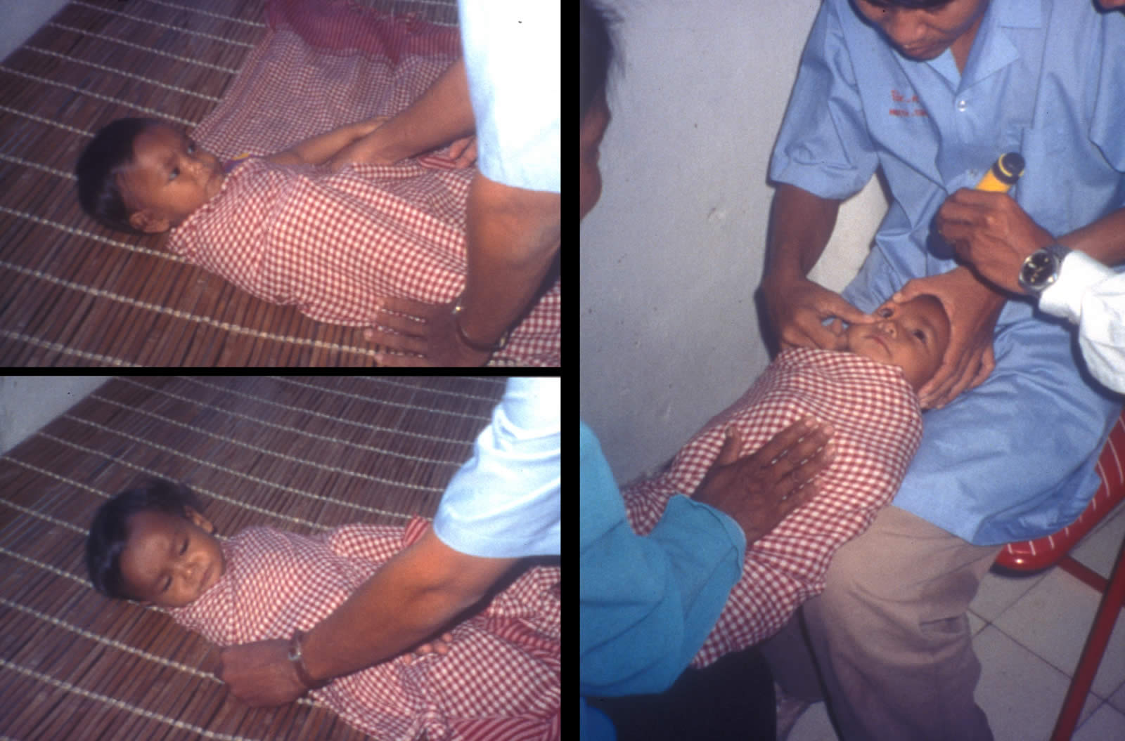 A young child, or a child who is unable to co-operate, needs to be managed carefully when he or she is being examined by an ophthalmologist or other eye health practitioner. The following steps aim to guide the health worker who has to manage such a child whilst assisting the examiner.