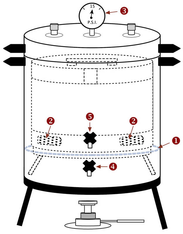 Then open the upper tap (5), which is the steam release tap, allowing all remaining steam to come out. The pressure gauge should now drop to zero psi.