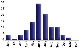 An interesting finding was the seasonal variation, showing a steady rise from April (7.7%) with a peak in June (26.7%) and then a gradual decline to October (3.8 %). During the summer the most common occupation is date farming. We concluded that most eye injuries at this time were related to the harvesting of dates which involved climbing trees and the risk of injuries from date leaves and wood. Further, with summer temperatures of 45-50 degrees Celsius, wearing protective devices is more difficult, with the result that people working on lathe machines are more prone to injuries from flying iron during these months.