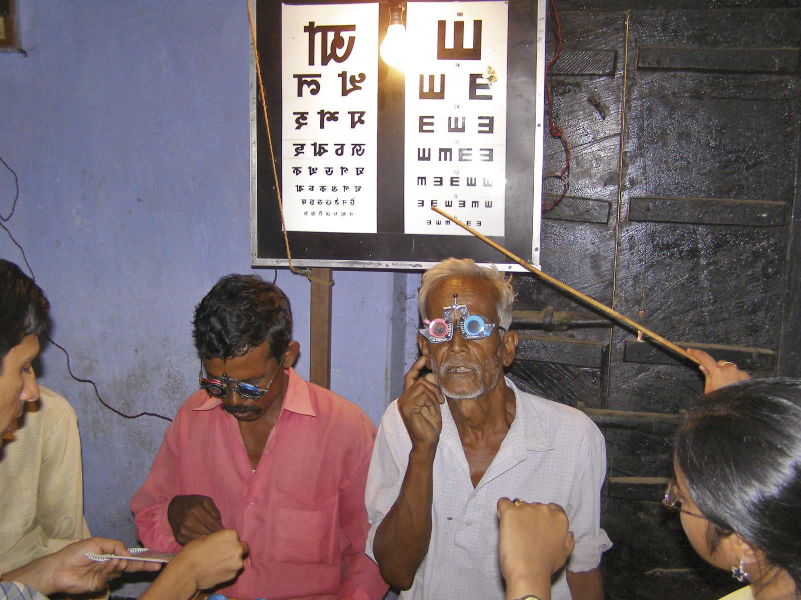 Patients are seen by the doctor after their visual acuity has been recorded. The anterior segment is examined with a torch for all cases and a portable slit lamp is used if further detailed examination is needed. The central fundus is examined with a direct ophthalmoscope. Particular attention is paid to disc evaluation to detect glaucoma. Known diabetics undergo pupil dilation and fundoscopy to detect diabetic retinopathy. Indirect ophthalmoscopy is performed to assess the central fundus grossly through hazy media. This helps to explain the prognosis better. Detailed indirect ophthalmoscopy is only done in conditions like high myopia. Applanation tonometry is performed in known glaucoma cases and patients with suspected pseudoexfoliation syndromes. We carry common spectacle powers and spectacle frames, as well as an edging machine. Spectacles are fitted and delivered on site only. For uncommon lens powers, orders are taken and delivered later through camp organisers. Dispensing low-cost spectacles helps to recover some of the costs of outreach camps and also ensures quality.