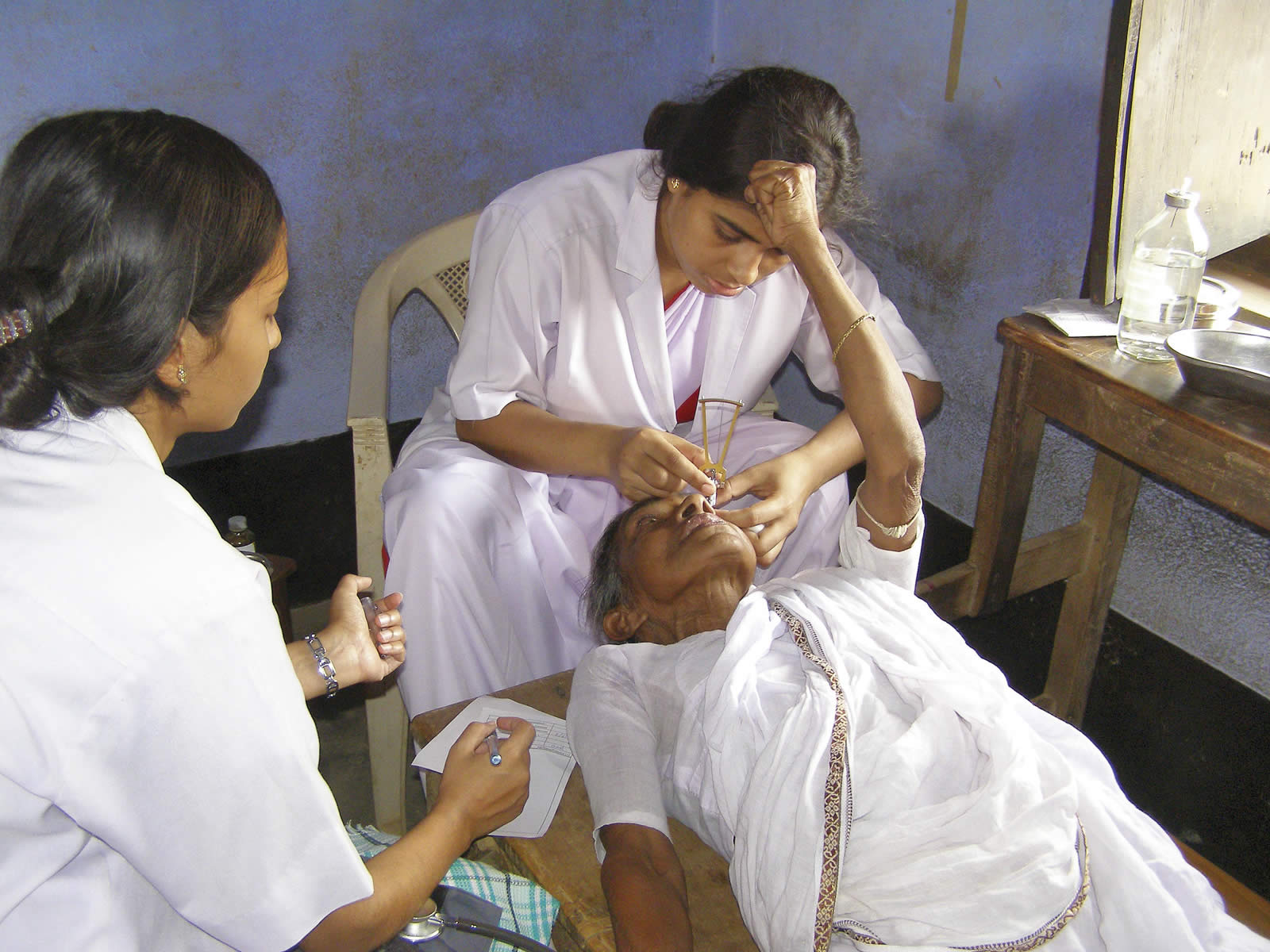 We give preference to people above the age of 50, because cataract, glaucoma and diabetic retinopathy are more common in this age group, and most of them cannot come to the hospital on their own without an escort. Children are the next priority group. Patients are registered and then their visual acuity is tested. The next step is a preliminary examination by an ophthalmologist. After that, some patients are directed for some basic investigations, such as Schiötz tonometry, lacrimal syringing, blood pressure recording and random urine sugar estimation. Some patients are directed for refraction, which is performed by the optometrists in a makeshift dark room. After this, patients are examined again by an ophthalmologist. The last step is counselling the patients who need surgery and fixing the date for surgery. We carry some essential eye drops and tablets, especially to camps in remote places, for the patients who need medical management.