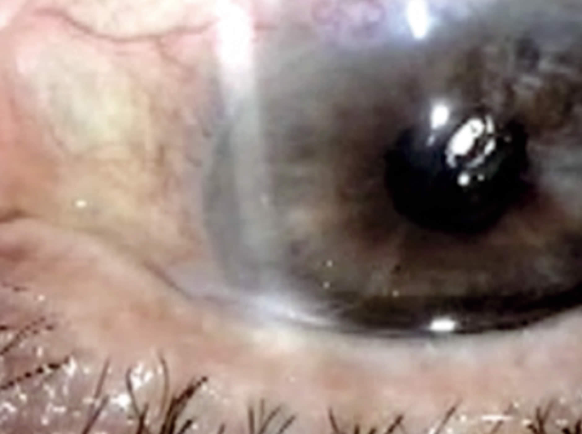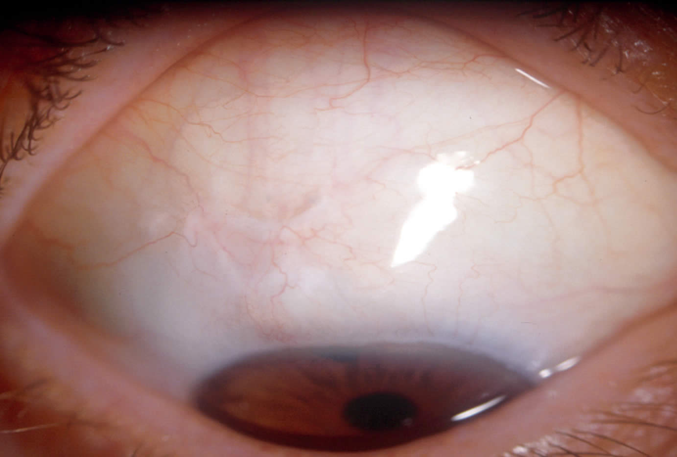 Figure 3. 5-Flurouracil and amethocaine precipitate in the lachrymal lake, indicating that 5FU has leaked onto the ocular surface © Ian Murdoch