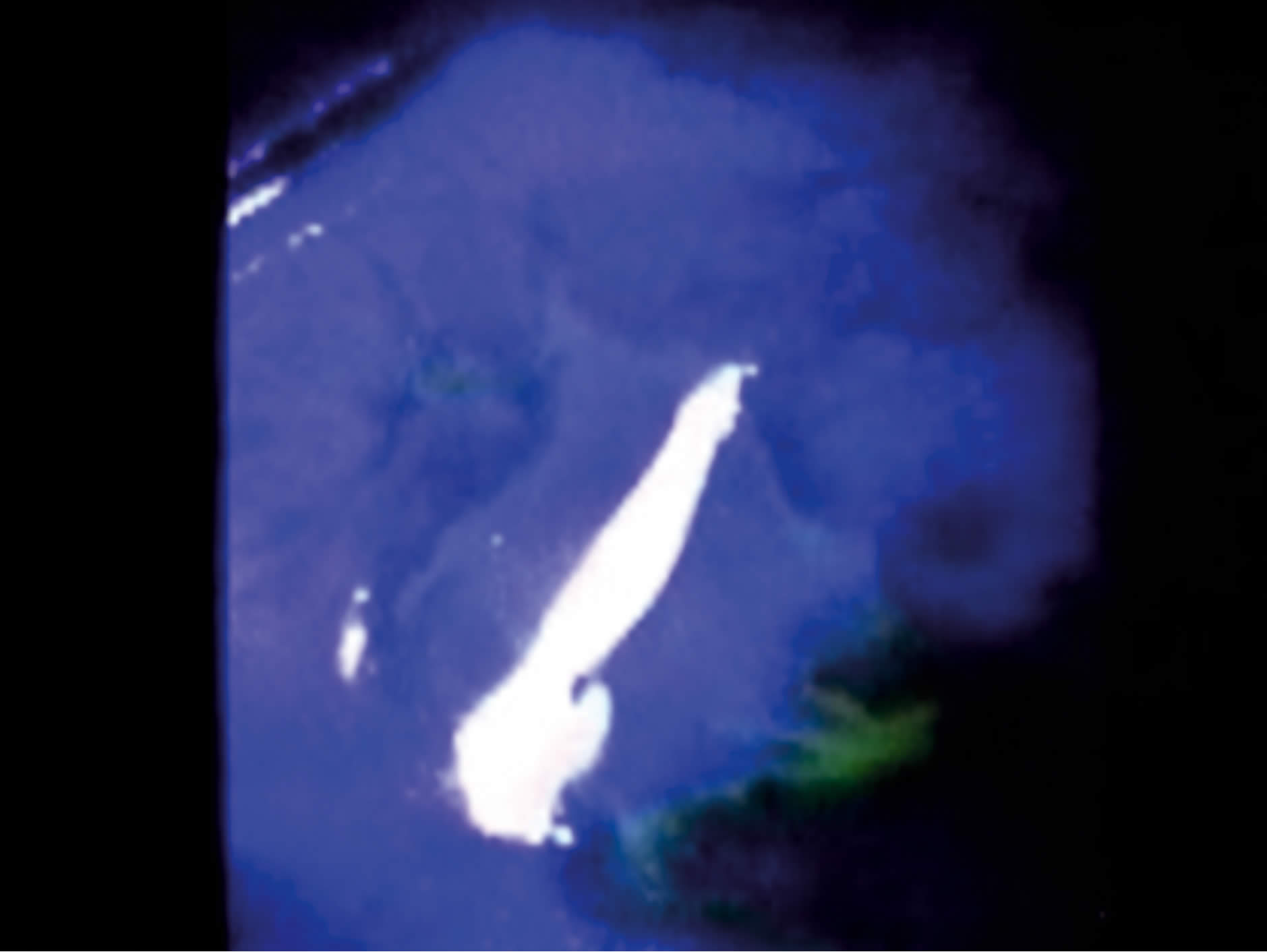 You can check there is no 5FU by administering a drop of tetracaine (amethocaine). The pH of these anaesthetic drops is acidic (around 5) and the pH of 5FU alkaline (around 9). When the two fluids meet, they result in a white precipitate that is visible and shows the 5FU has leaked onto the ocular surface (Figure 3).