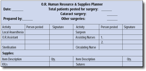 - Standardisation. The hospital should follow a standard surgical procedure. This is particularly important when there is more than one ophthalmologist. Better instrumentation, training of paramedical staff and patient flow, all contribute to increasing efficiency and quality of care. Standard surgical procedures must be periodically reviewed against outcomes, new technologies and new instrumentation.