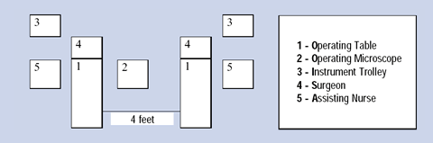 - Operating room layout and work-flow. The OR layout, and workflow within it, has a maximum bearing on efficiency in terms of how many operations are done. The OR layout, for example, could have two tables with a floor model operating microscope between them (see Illustration 2). While the surgeon is operating on one table, the second assisting nurse can prepare the patient on the next table. Variations of this model are in practice elsewhere. For example, in a surgical practice in Germany, there is only one table on wheels with three other such tables, with patients on them, in an adjoining preparation room. When the surgery is completed, the patient is wheeled out and another patient wheeled in. The basic underlying principle is the same – cutting down on the surgeon’s waiting time between operations.