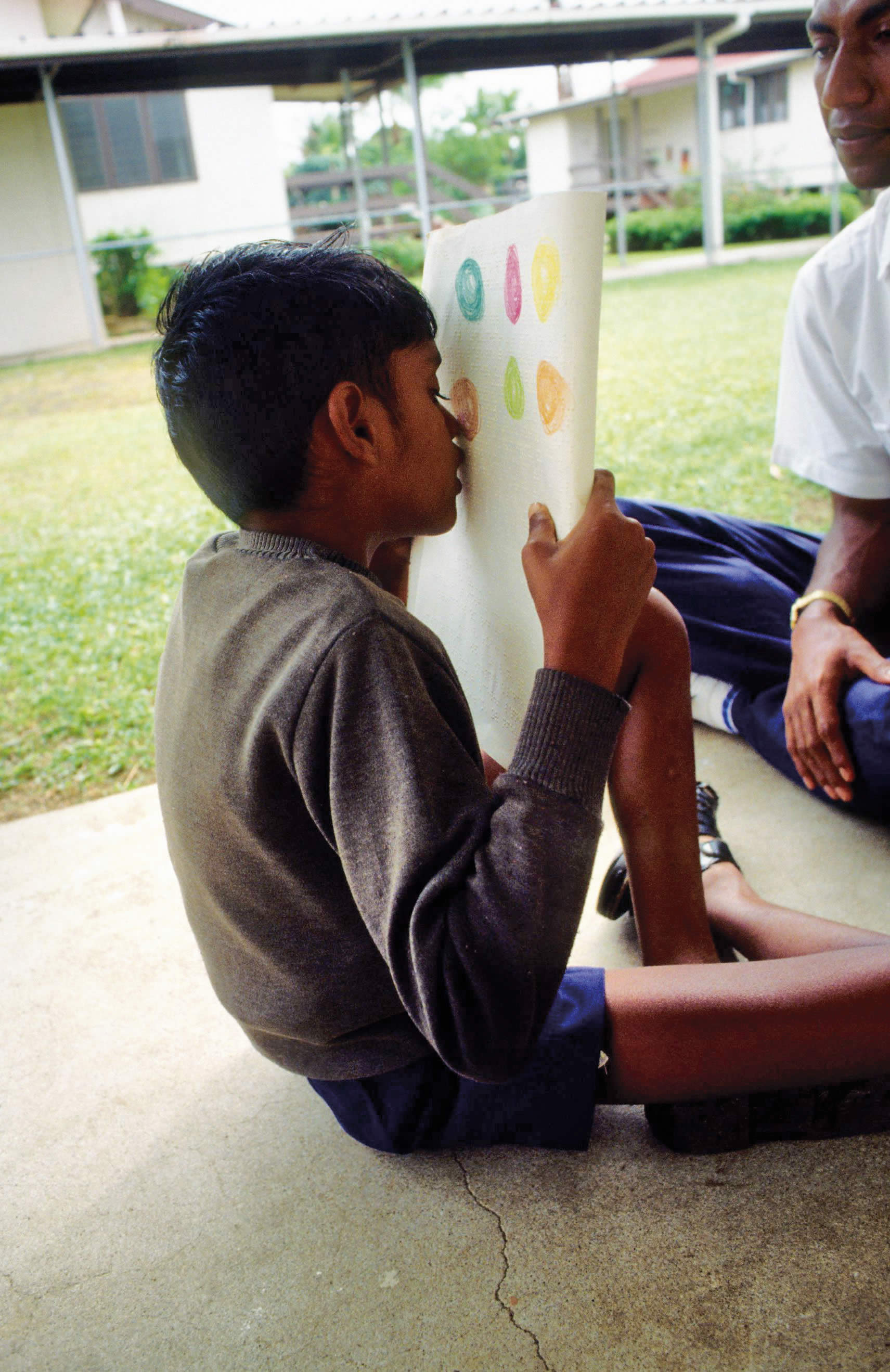 A child’s ability to identify different colours and shades is assessed. FIJI. © Karin van Dijk