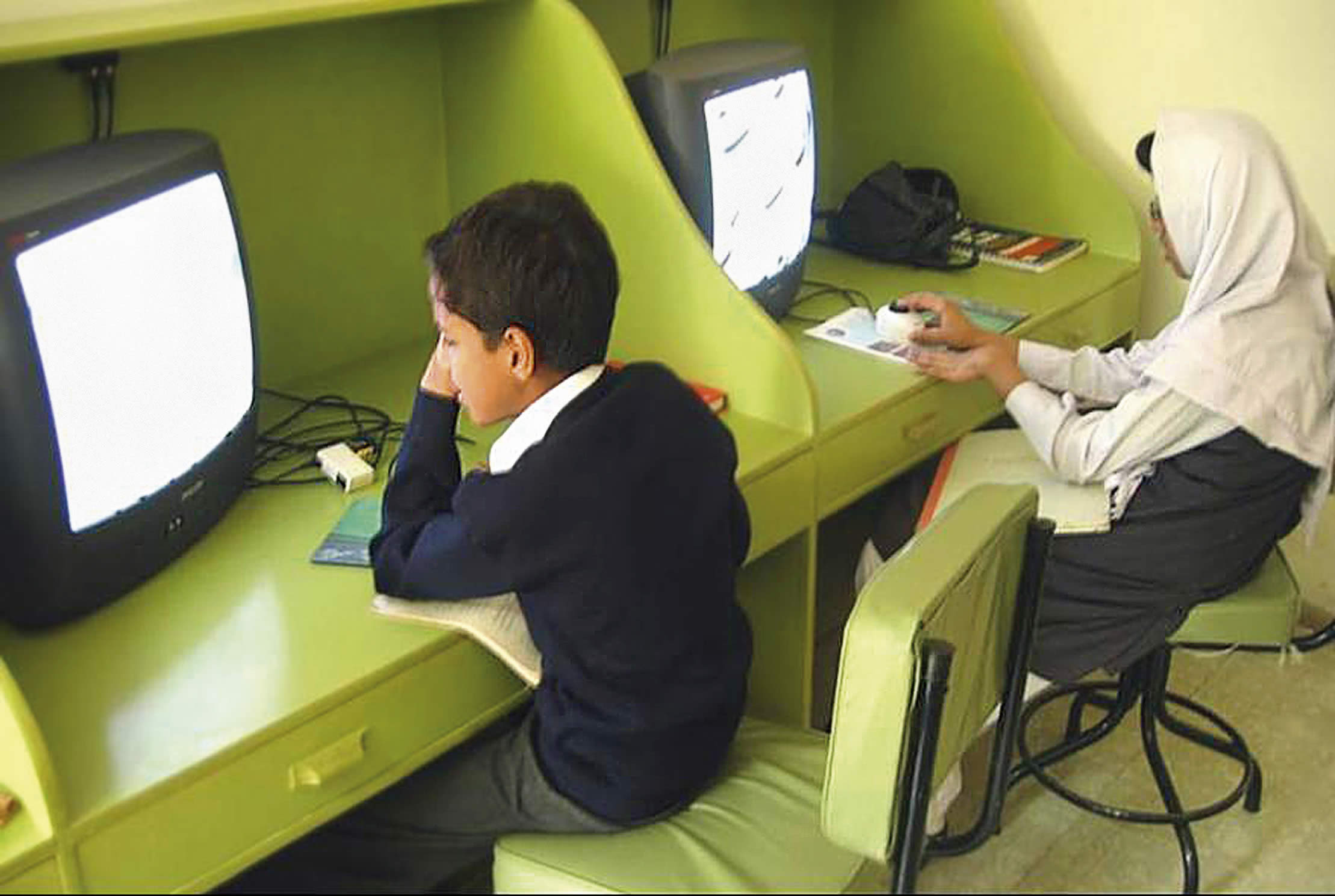 Children have access to closed-circuit televisions in a local library. These enlarge printed text, making it much easier to read. PAKISTAN. © Hasan Minto