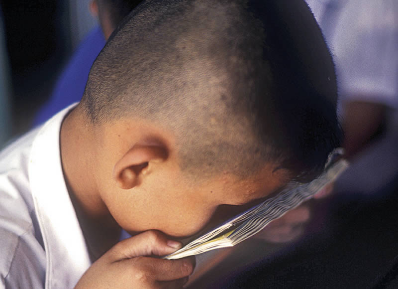 Many children with low vision are able to read by using their strong ability to focus on near objects (accommodation). THAILAND. © Clare Gilbert