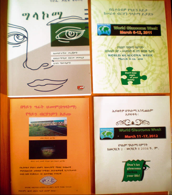 The first glaucoma message was broadcast on television in 2008 and was paid for by Light for the World. There were also programmes and educational messages on national and regional radio stations. We approached the media through the OSE and through Menelik Hospital, where the Department of Ophthalmology is based. The people working in the media were interested in broadcasting health-related programmes and were very helpful. The Glaucoma Group produced posters, banners, brochures, leaflets, a book about glaucoma translated into Amharic, caps, and T-shirts, which were given to glaucoma patients and their families.