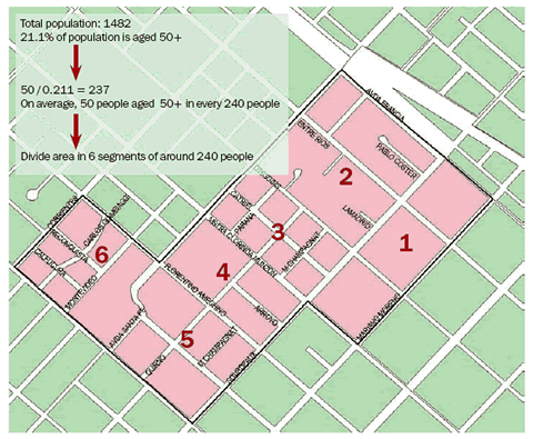 The quality of surveys depends to a large extent on how well the selection of individuals occurs within clusters. If blind people are more likely (or less likely) to be included, then the prevalence of blindness in the survey will not refl ect the true prevalence in the area. In RAAB, households within clusters are selected through compact segment sampling.6 A map is obtained of the population unit, showing major landmarks and the approximate distribution of neighbourhoods and households (Figure 1). If no map is available, then the village members can create one. The area is then divided into segments, so that each segment includes approximately 50 people aged over 50. For instance, if 300 people aged over 50 live in the area, it will be divided into six segments. One of the segments is chosen at random by drawing lots.