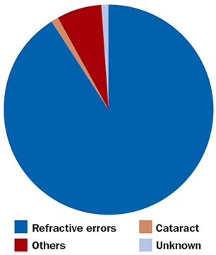 There was only one blind child in this survey, a male with bilateral phthisis bulbi. Refractive errors were the major cause of low vision in this study. Out of the 142 children with low vision, 130 children had uncorrected refractive errors and 10 had causes such as hereditary maculopathies, optic nerve atrophy, amblyopia, etc. In one child the cause of low vision was cataract, and in another child the cause could not be determined (Figure 1).