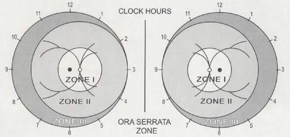 Zone II | A circle is drawn with the optic disc as the centre and disc to nasal ora serrata as the radius. The area between zone I and this boundary constitutes zone II |