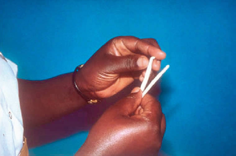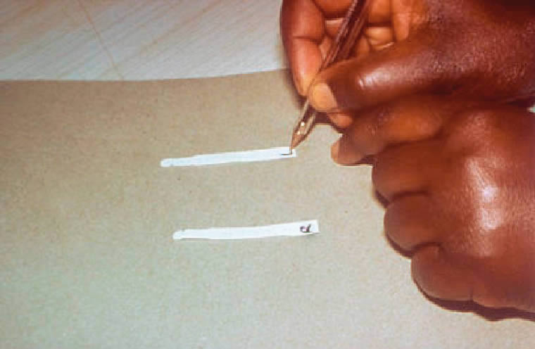 - Using the package scale, measure the length of the moistened area on the strip, from the notch, and indicate this with a pen mark (Figure 6).