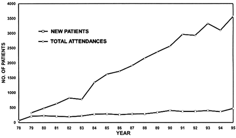 When setting up a screening programme it is very important that adequate arrangements are made for treatment of the cases identified. Initially there will be a backlog of untreated cases before a steady state is reached (Fig. 2). Our population of 3,500 diabetics, with an established screening programme of 18 years, yields an average of 12 new cases of proliferative retinopathy and 42 new cases of maculopathy to be treated each year. The workload increases every year in the assessment and treatment clinic, as well as the screening clinic, as new patients enter the programme (Fig. 3). There is a net gain of over 200 patients into the programme each year and 7% of patients screened are transferred to the assessment clinics.