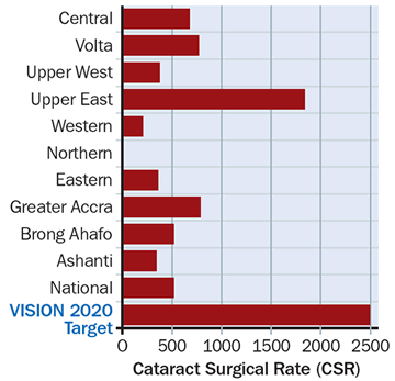 The target in our cataract services is to attain a surgical output above our national VISION 2020 cataract surgical rate (CSR) target of 2,500. Figure 2 shows the CSR of the various regions.