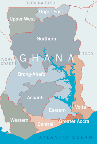 Ghana is a west African country bordered on the south by the Atlantic Ocean, and the north, east, and west by the Republics of Burkina Faso, Togo, and Ivory Coast respectively. It has a population of 20,771,382. Prevalence of blindness is estimated at one per cent. It currently has 52 ophthalmologists and 216 ophthalmic nurses (National Eye Care Secretariat), with nearly half of the ophthalmologists (19) located in the national capital and its environs. The health sector attracted 7.9 per cent of government budget in 2002 and 12.3 per cent in the 2006 budget. Currently there is a comprehensive national health insurance policy being implemented that covers most of the common eye operations done in the country.