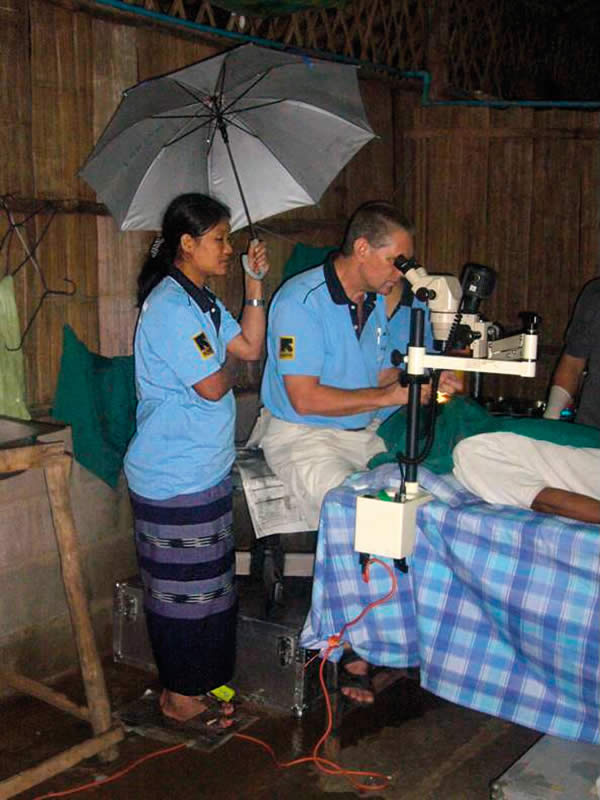 For example, Frank Green, a consultant ophthalmologist at Aberdeen University, has effectively been the sole ophthalmologist to the Karen refugees who have fled from Myanmar (Burma) to Thailand. Since 1990, he has made two to three visits each year. For political reasons, the Karen cannot receive ophthalmic medical upport from their Thai hosts. The size of the community is sufficiently small to make it difficult to support and sustain a full-time ophthalmologist. However, over the years, a number of medical assistants have been trained locally to identify cataract and manage non-surgical cases.