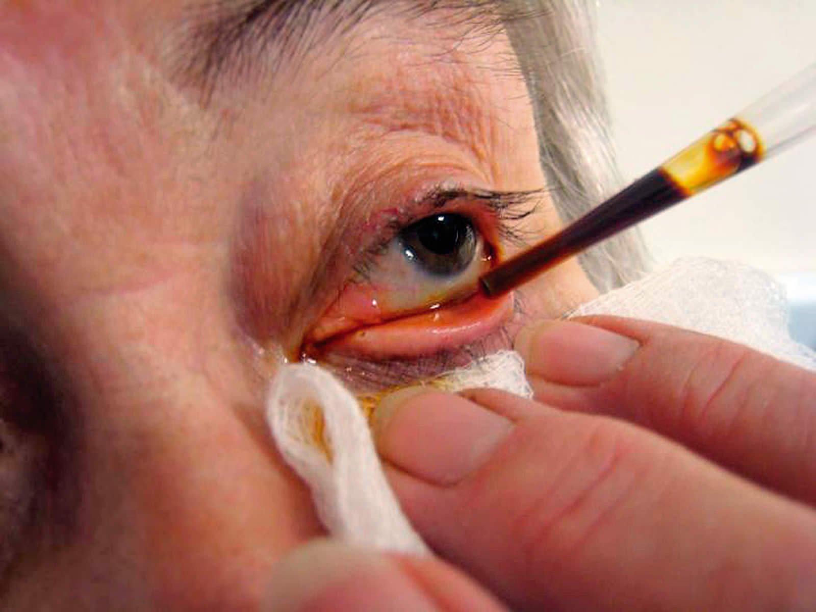 - Instil povidone-iodine (Betadine) 5% aqueous eye drops (Figure 1).
