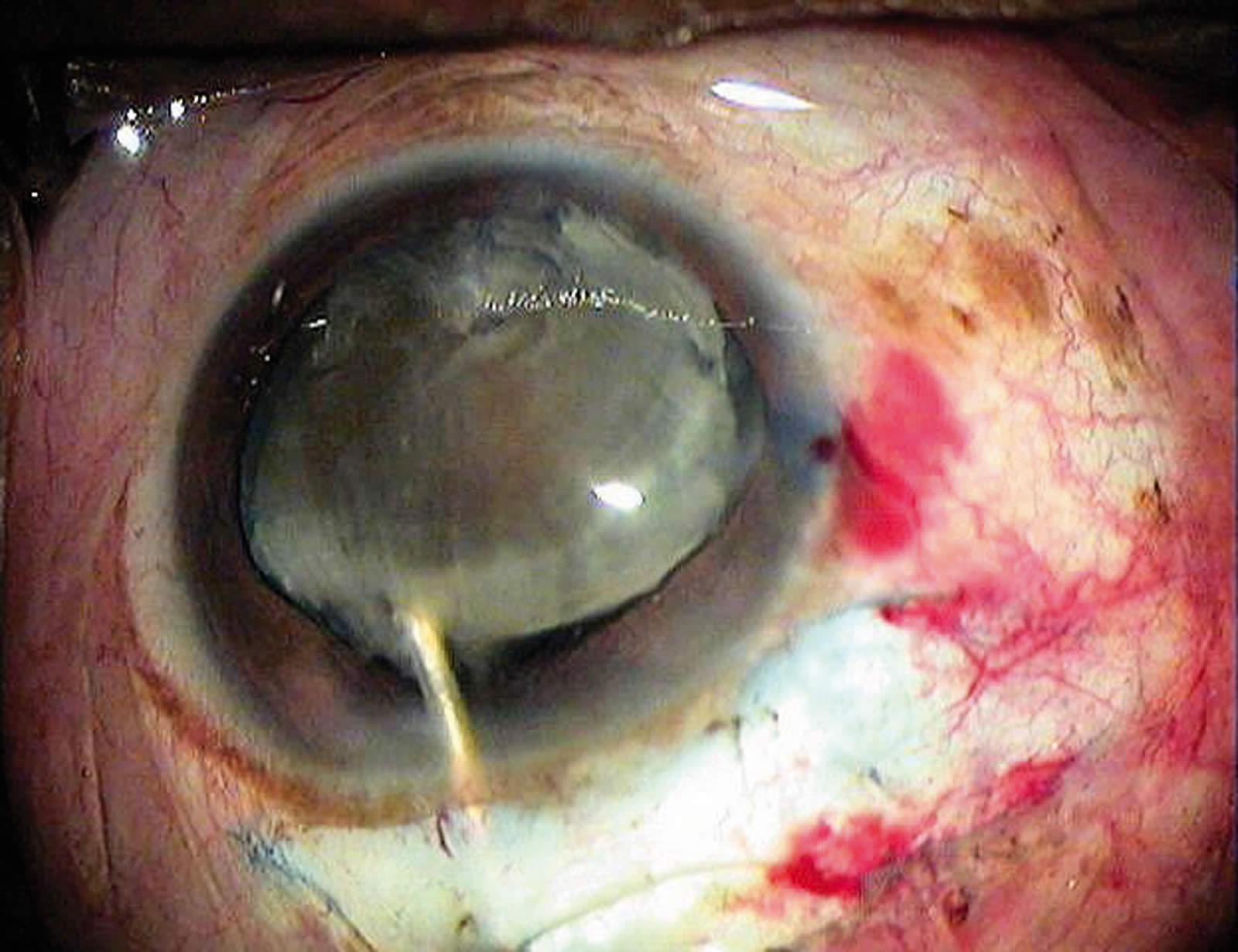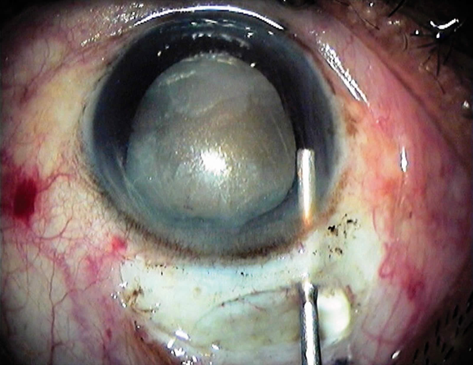 - Judge the depth of half-thickness sclerocorneal tunnel incisions by observing how clearly you can see the crescent knife during the incision (Figure 4). If the crescent knife can be seen very clearly, this indicates that the scleral layer is very thin and that the crescent knife might perforate to the outside. (causing what is known as a ‘buttonhole’)