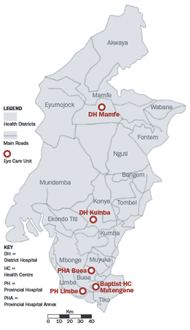 The Cameroon health structure divides the country into health provinces (e.g. South West Province) which are sub-divided into health districts (e.g. Kumba, Mamfe). Each health district has a district hospital. The province has a provincial hospital that is the referral hospital for district hospitals. In the South West Province, a second provincial hospital was created recently in Buea. The eye units in the provincial hospital Limbe, the Baptist Church Health Centre in Mutengene, the district hospital in Mamfe and the district hospital in Kumba (to start later in the year) provide secondary level eye care services. Tertiary eye services (retinal detachment surgery, diabetic retinopathy laser photocoagulation, paediatric surgery, etc) are not provided by any of the eye units in the South West Province. The eye unit in the provincial hospital Annex Buea (newly created) will also provide secondary level eye care, but not major ocular surgery (cataract, etc.) because it is staffed with an eye nurse only. All eye units are in existing health facilities providing general health care. Apart from the Mutengene Eye Unit, which is a Baptist Church institution, all other eye units are within government health facilities.