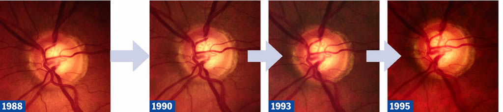 The appearance of any of the features of a glaucomatous ONH, or the exacerbation of these features compared to a previous record, is indicative of a progression/ worsening of the disease.