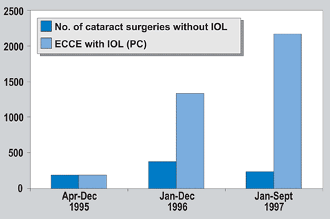 Good counselling has been one of the prime contributors behind this success. In 1995, 50% of the 377 cataract operations done between April and December were ECCE with IOL; by 1996 this figure had increased to 78% of 1,714 cataract operations performed over the 12 months. Data for the first nine months of 1997 show that 90% of the 2,406 cataract operations done were ECCE with IOL (Fig. 1).
