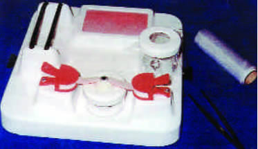 Fig. 2 shows a skills head which can hold an animal eye or a plastic eye. This simulates a human head and can be used under a microscope.