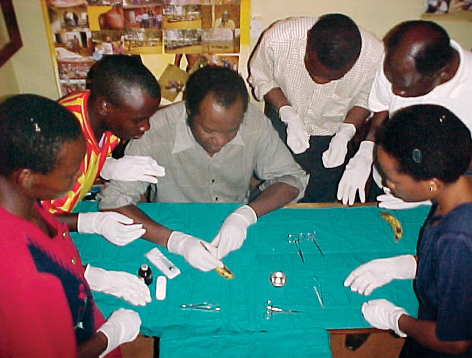 After everyone has successfully mastered incision and suturing skills, they each receive their own surgical kits for the field visits.