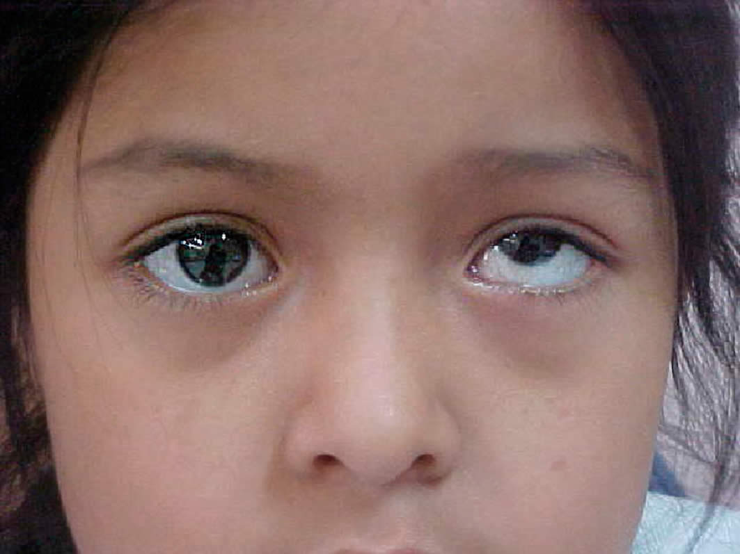 The person who has strabismus will have the reflection in the centre of the pupil of only one eye (the fixing eye) and the other reflection will be seen over the iris or definitely away from the centre of the pupil (the deviated eye). See Figures 5 and 6.