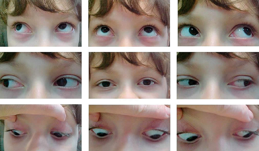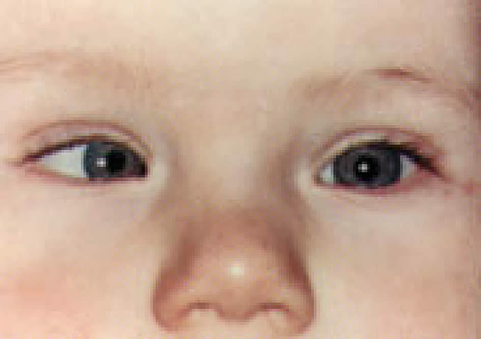 - Sometimes strabismus develops due to a serious disease affecting the nervous system or eye. For example, squint (both exotropia and esotropia) can be the first sign of retinoblastoma, a cancer of the eye that is fatal unless treated promptly. Outward deviation of the eye with drooping of the lid occurs due to nerve damage which can be a sign of a brain tumour (Figure 9). Although relatively rare, these causes must be ruled out before treatment for the misalignment can begin.