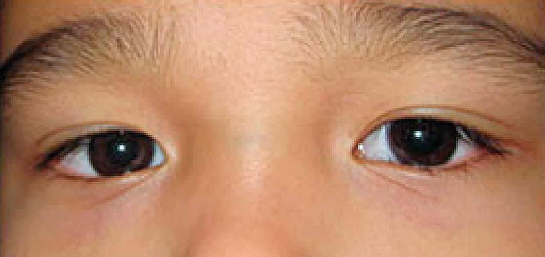 It may help to shine a small light, such as a penlight, in the patient’s eyes. A patient who has straight, aligned eyes (no strabismus) will have a reflection in the centre of each pupil or nearly so (Figure 4).