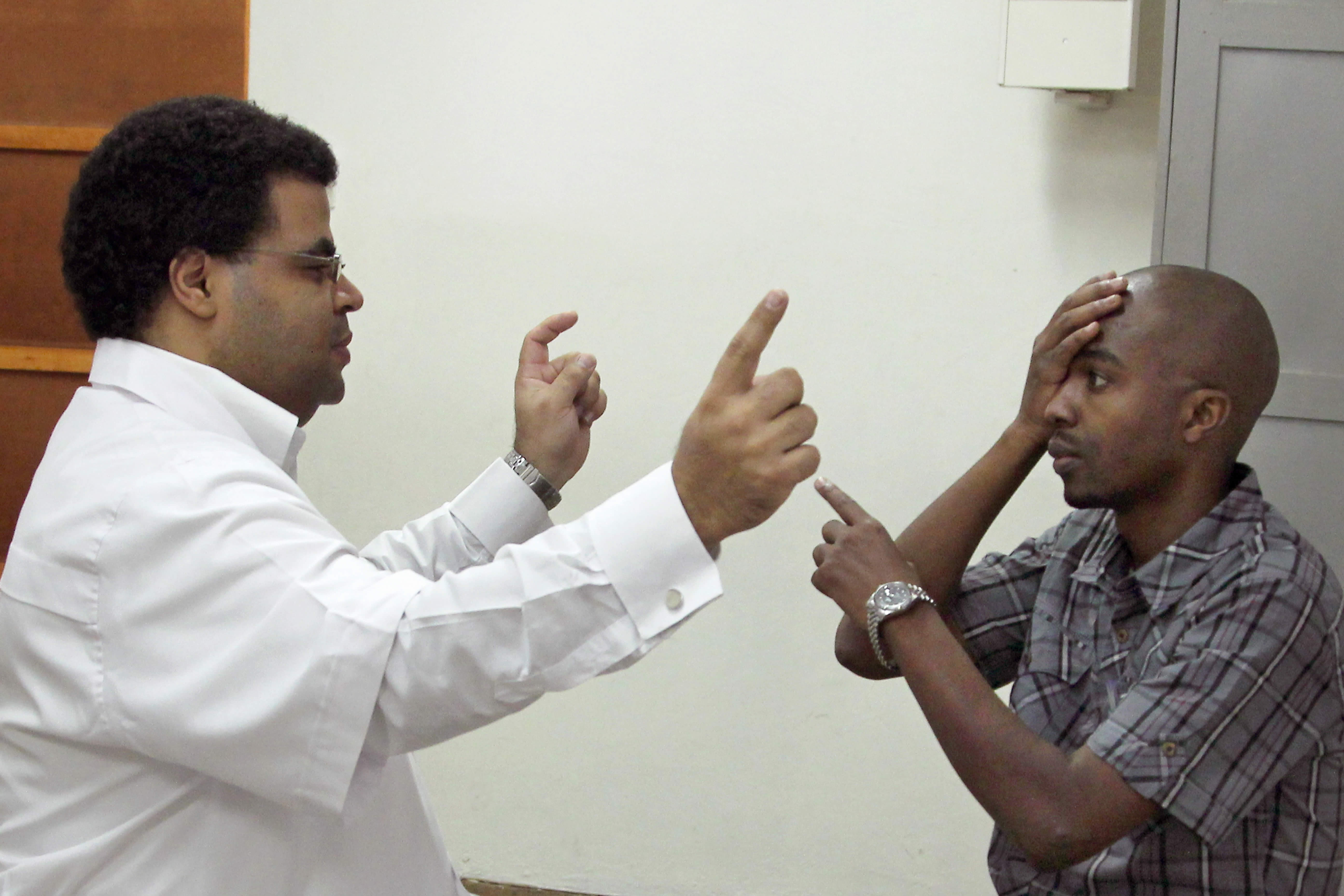 Figure 5. Testing visual fields to confrontation. The examiner’s left eye is closed, so he can compare the field of his right eye with the field of the patient’s left eye. TANZANIA © Heiko Philippin
