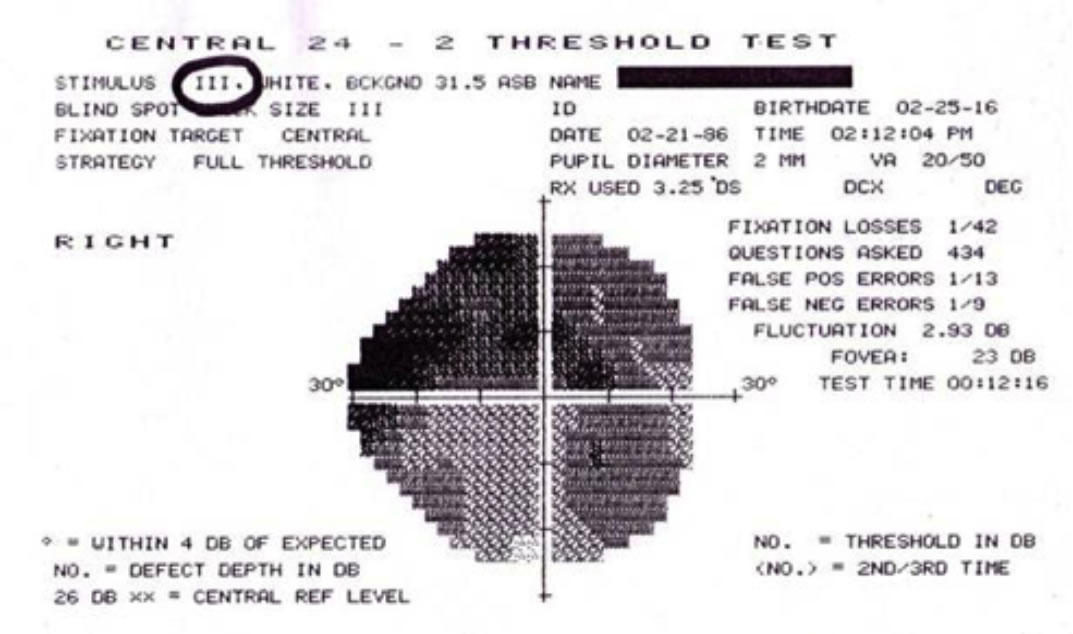 The standard size III in SAP (standard automated perimetry) is mainly used for easier and faster mapping of the blind spot. Its use in all VF testing is not a law! Using size IV is compatible with all analysis software. Moreover, those patients are well trained in VF testing, and looking at their new test results may improve their depression and encourage their compliance with medications (Figure 12).